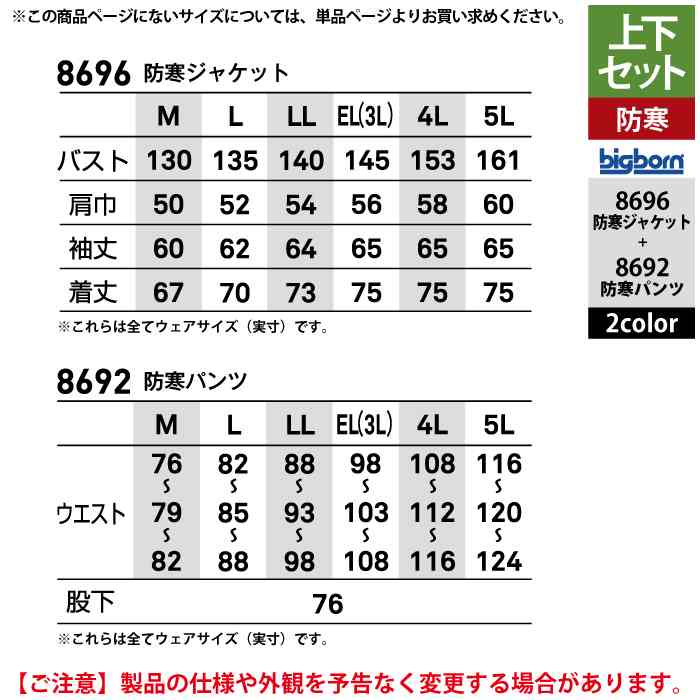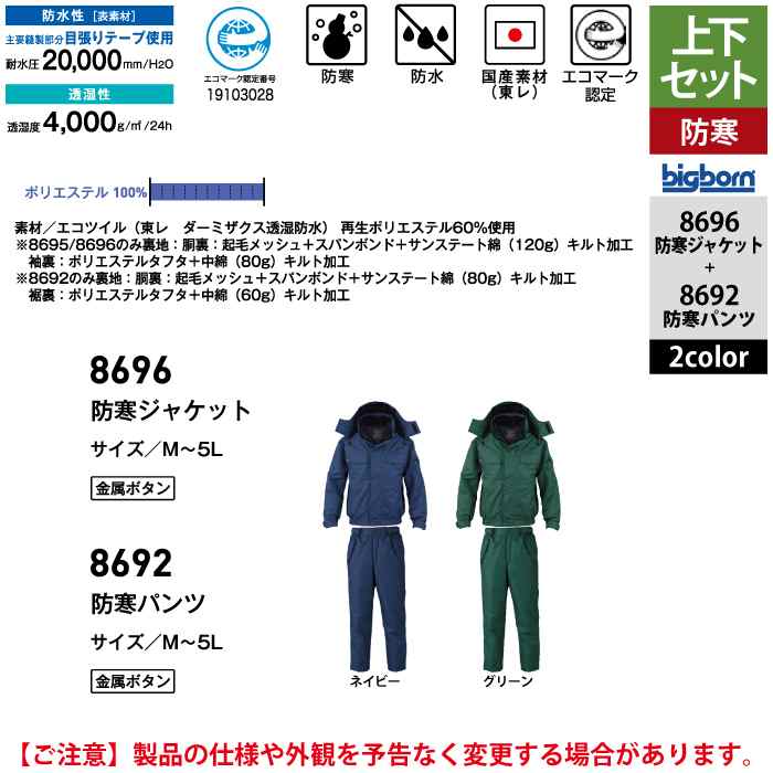 ビッグボーン bigborn 作業服 上下セット 8696 防寒ジャケットM-3L と 8692 防寒パンツ M-3L 作業着 作業ズボン
