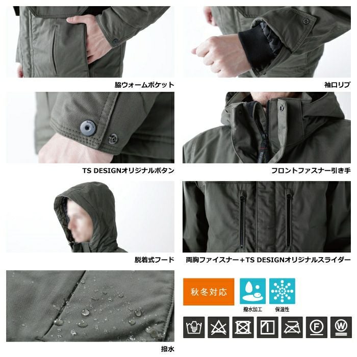 ●関連商品※5127ライトウォームハーフコート※5126ライトウォームジャケット※5120ライトウォームオーバーオール※5122ライトウォームパンツ●秋冬用●素材:ブロックツイル(撥水加工) 綿100% [中綿]ポリエステル100%●撥水加工、保温性、脇ウォームポケット、袖口リブ、TS DESIGNオリジナルボタン、フロントファスナー引き手、脱着式フード、両脇ファスナー+TS DESIGNオリジナルスライダー、裏地TS DESIGNオリジナルエンボスプリント●サイズ:S(着丈/71、肩巾/44、袖丈/62、胸囲/112)、M(着丈/73、肩巾/46、袖丈/64、胸囲/117)、L(着丈/75、肩巾/48、袖丈/66、胸囲/122)、LL(着丈/77、肩巾/50、袖丈/68、胸囲/127)、3L(着丈/79、肩巾/52、袖丈/70、胸囲/132)、4L(着丈/81、肩巾/54、袖丈/70、胸囲/141)、5L(着丈/83、肩巾/56、袖丈/70、胸囲/150)、6L(着丈/83、肩巾/58、袖丈/70、胸囲/159)●カラー:チャコールグレー、ネイビー、カーキ