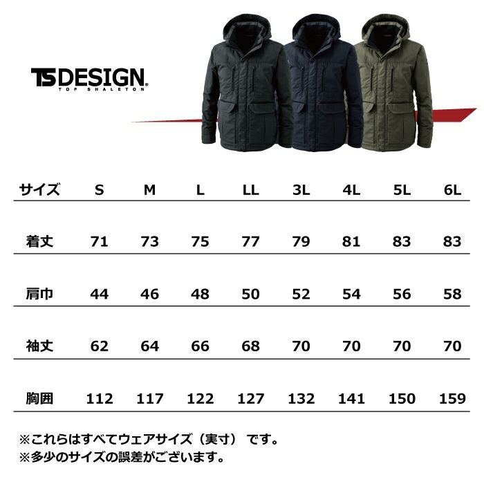 ●関連商品※5127ライトウォームハーフコート※5126ライトウォームジャケット※5120ライトウォームオーバーオール※5122ライトウォームパンツ●秋冬用●素材:ブロックツイル(撥水加工) 綿100% [中綿]ポリエステル100%●撥水加工、保温性、脇ウォームポケット、袖口リブ、TS DESIGNオリジナルボタン、フロントファスナー引き手、脱着式フード、両脇ファスナー+TS DESIGNオリジナルスライダー、裏地TS DESIGNオリジナルエンボスプリント●サイズ:S(着丈/71、肩巾/44、袖丈/62、胸囲/112)、M(着丈/73、肩巾/46、袖丈/64、胸囲/117)、L(着丈/75、肩巾/48、袖丈/66、胸囲/122)、LL(着丈/77、肩巾/50、袖丈/68、胸囲/127)、3L(着丈/79、肩巾/52、袖丈/70、胸囲/132)、4L(着丈/81、肩巾/54、袖丈/70、胸囲/141)、5L(着丈/83、肩巾/56、袖丈/70、胸囲/150)、6L(着丈/83、肩巾/58、袖丈/70、胸囲/159)●カラー:チャコールグレー、ネイビー、カーキ