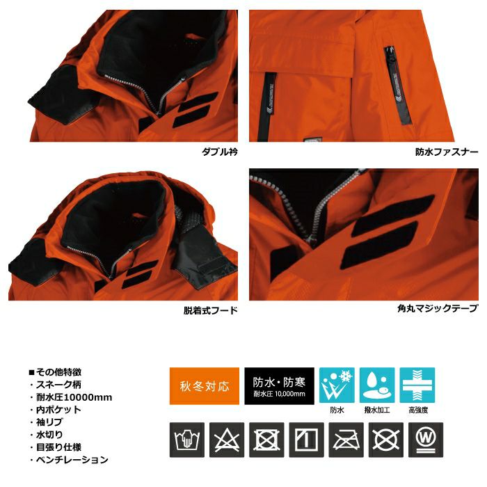<特長>スネーク柄、耐水圧10,000mm、ダブル衿、内ポケット、袖リブ、防水ファスナー、脱着式フード、水切り、角丸マジックテープ、目張り仕様、ベンチレーション