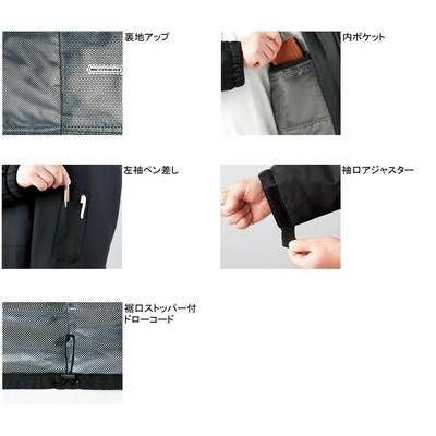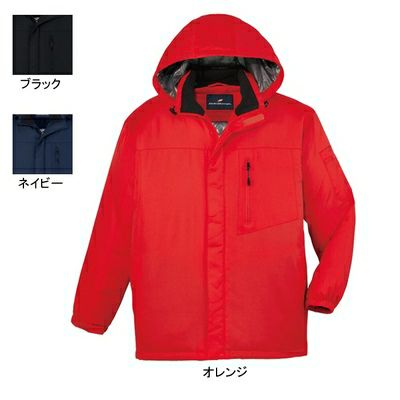 ●関連商品※48480防寒ブルゾン(フード付)※48483防寒ハーフコート(フード付)※48481防寒パンツ●秋冬用●素材/リップストップ 表地・ポリエステル100%、裏地・アルミプリント加工タフタ中綿100gキルト●裏地アップ●内ポケット●左袖ペン差し●袖口アジャスター●裾口ストッパー付ドローコード●サイズ:M(胸囲/125、肩幅/54、袖丈/58、着丈/76)、L(胸囲/129、肩幅/56、袖丈/59、着丈/78)、LL(胸囲/135、肩幅/58、袖丈/60、着丈/80)、EL(胸囲/141、肩幅/60、袖丈/62、着丈/82)、4L(胸囲/147、肩幅/62、袖丈/64、着丈/84)、5L(胸囲/153、肩幅/64、袖丈/64、着丈/86)●カラー:オレンジ、ネイビー、ブラック