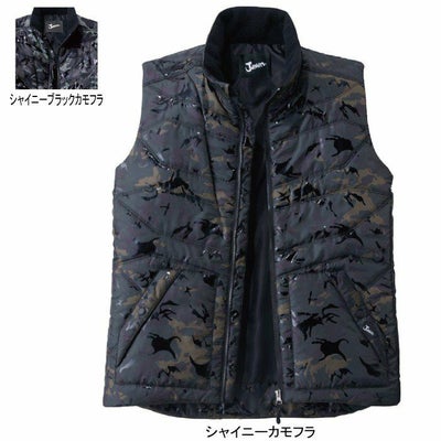 ●関連商品※58700防寒ジャンパー●秋冬用●素材:高濃度タフタ 本体/ポリエステル100% 裏地/ポリエステルタフタ 中綿 120g キルト、フロント/樹脂ファスナー、ポケット/樹脂ファスナー、ボタン/金属ボタン●野帳対応、右身頃内ポケット、胸ファスナーポケット、背ネーム、左身頃内側ペン差し、ワンポイント●サイズ:S(胸囲/102、肩幅/37、着丈/62)、M(胸囲/108、肩幅/39、着丈/65)、L(胸囲/112、肩幅/41、着丈/67)、LL(胸囲/116、肩幅/43、着丈/69)、EL(胸囲/122、肩幅/45、着丈/69)、4L(胸囲/128、肩幅/47、着丈/71)●カラー:シャイニーカモフラ、シャイニーブラックカモフラ
