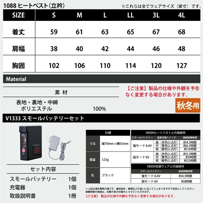 作業服 作業着 村上被服 HOOH 鳳凰 作業服 1088setR5 ヒートベスト立衿スモールバッテリのセット S