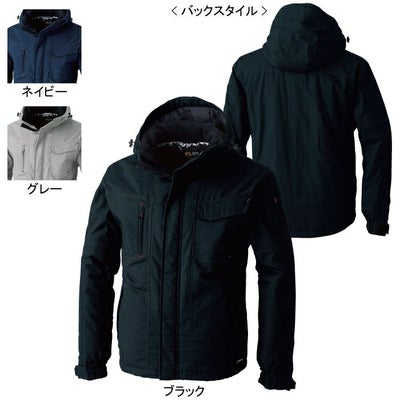●秋冬用●素材:[表]綿100% [裏]ポリエステル100% [中綿]ポリエステル100%金属ファスナー、フード:樹脂ファスナー●タフ素材、撥水、背中アルミプリント、フード絞り、衿リブ、ファスナー隠し、裾絞り、ヘルメット着用対応フード、着脱式フード、胸ペン差し、袖ペン差し、隠し面ファスナー、内ポケット、逆玉緑ポケット、アジャストテープ●サイズ:S(胸囲/116、肩巾/48、着丈/70、袖丈/60)、M(胸囲/120、肩巾/50、着丈/72、袖丈/62)、L(胸囲/124、肩巾/52、着丈/74、袖丈/64)、LL(胸囲/128、肩巾/54、着丈/76、袖丈/66)、3L(胸囲/134、肩巾/56、着丈/78、袖丈/68)、4L(胸囲/142、肩巾/58、着丈/78、袖丈/68)、6L(胸囲/152、肩巾/60、着丈/78、袖丈/68)●カラー:ネイビー、ブラック、グレー