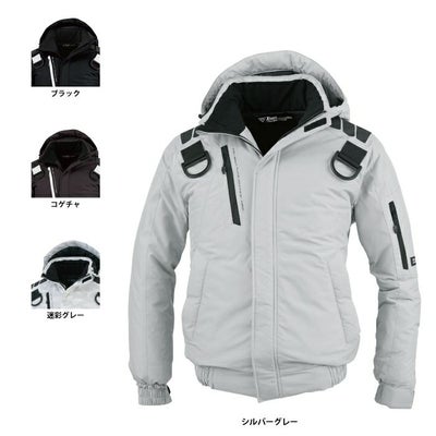 ●関連商品※120防寒パンツ●秋冬用●素材:[表]ナイロン100%(ナイロンタッサー) [裏]ポリエステル100% [中綿]ポリエステル100%、樹脂ファスナー、樹脂ボタン(ドットボタン)、金属ボタン(ドットボタン)●撥水加工、保温性、[背中]背中ランヤード通し口は上下可動ファスナーで風の侵入を最大限防ぐとともに適度な位置調整が可能(実用新案出願中)、[袖口]袖口マジックテープ調整、[襟]襟裏フリース仕様で保温性アップ、[中綿]軽量で暖かいマイクロ綿を使用、[前裾]前裾にはずり上がり防止ループ付き(ハーネスのベルトに取り付けます)、[フード]フードはスピンドル調整+アジャスト調整。ヘルメット対応大型フード(取り外し可能)、[右胸]右胸ファスナー付きポケット、[両脇]両脇ファスナー付きポケット。フックかけDカン付き●サイズ:S(胸囲/112、裄丈/81、着丈/64)、M(胸囲/116、裄丈/85、着丈/66)、L(胸囲/120、裄丈/88、着丈/68)、LL(胸囲/124、裄丈/91、着丈/70)、3L(胸囲/128、裄丈/94、着丈/72)、4L(胸囲/132、裄丈/97、着丈/74)、5L(胸囲/136、裄丈/98、着丈/74)●カラー:シルバーグレー、ブラック、コゲチャ、迷彩グレー