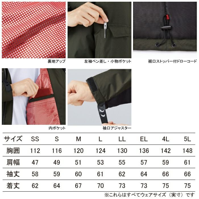 ●関連商品※48493防寒コート(フード付)※48491防寒パンツ●秋冬用●素材:オックス●混率:[表地]ポリエステル100% [裏地]アルミプリント加工タフタ・ポリエステルタフタ 中綿120gキルト、フロント/樹脂ファスナー、ポケット/樹脂ファスナー、ボタン/金属ボタン●撥水加工、防風、耐水圧2,000mm、野帳対応、取り外し式フード(ファスナー)、裏地アップ、内ポケット、左袖ペン差し、小物ポケット、袖口アジャスター、袖口ストッパー付ドローコード、衿フリース仕様、袖口内ジャージ仕様、背ネーム、ワッペン、オリジナルスライダー、ハンドウォーマーポケット、反射プリント(右脇ポケット・後右肩)、オーロラテープ(後身裾)●サイズ:SS(胸囲/112、肩幅/47、袖丈/58、着丈/62)、S(胸囲/116、肩幅/49、袖丈/59、着丈/64)、M(胸囲/120、肩幅/51、袖丈/60、着丈/67)、L(胸囲/124、肩幅/53、袖丈/61、着丈/70)、LL(胸囲/130、肩幅/55、袖丈/62、着丈/73)、EL(胸囲/136、肩幅/57、袖丈/64、着丈/73)、4L(胸囲/142、肩幅/59、袖丈/66、着丈/75)、5L(胸囲/148、肩幅/61、袖丈/66、着丈/75)●カラー:カーキ、ブラック、オレンジ