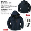 ●秋冬用●素材:タフタ[表]ポリステル100%、[裏]ポリエステル100%、[中綿]ポリエステル100%、ファスナー/フロント:プラスティック(引き手 金属)、ポケット:プラスティック(引き手 金属)、ボタン/プラスティック●着脱フード式ヘルメットに対応、クロ反射パイピング前身・背部分、ファスナー引き手、フード調整スピンドル、小型タブレットが入る右胸ポケット、左袖ペン差し、逆玉ポケット、左胸ファスナー付きポケット、袖口調整タブ●サイズ:M(着丈/70、肩幅/48、袖丈/61、胸囲/123)、L(着丈/72、肩幅/50、袖丈/63、胸囲/128)、LL(着丈/74、肩幅/52、袖丈/65、胸囲/133)、XL(着丈/76、肩幅/54、袖丈/67、胸囲/138)、4L(着丈/76、肩幅/56、袖丈/67、胸囲/143)、5L(着丈/76、肩幅/58、袖丈/67、胸囲/148)●カラー:ブラック、ネイビー