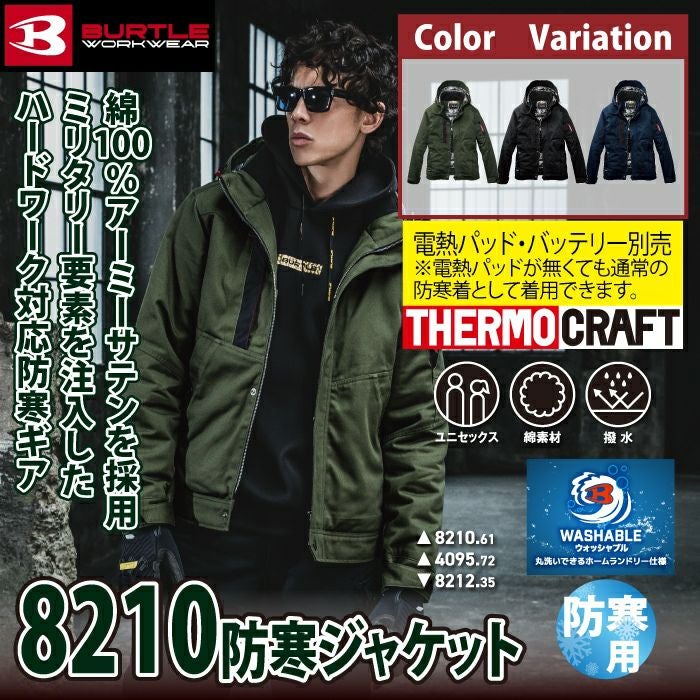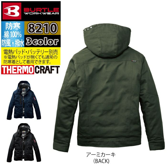 TC対応!ミリタリー調デザイン バートル BURTLE 作業着 防寒着 8210 防寒ジャケット フード付 S-XL 作業服 おしゃれ 綿100% 撥水 保温 TC500サーモクラフト対応