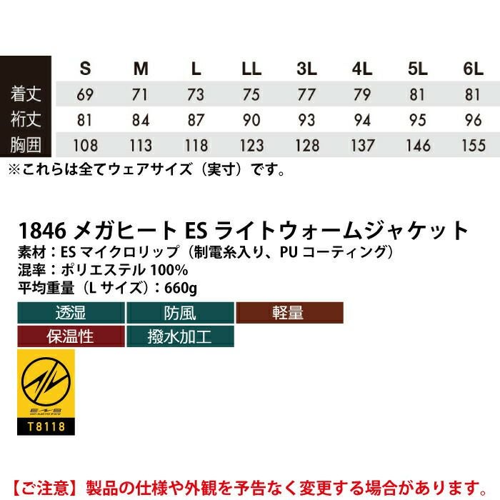 藤和 TSDESIGN 作業服 作業着 作業ズボン 藤和 TSDESIGN 防寒着 秋冬用 1846 メガヒートESライトウォームジャケット S-LL