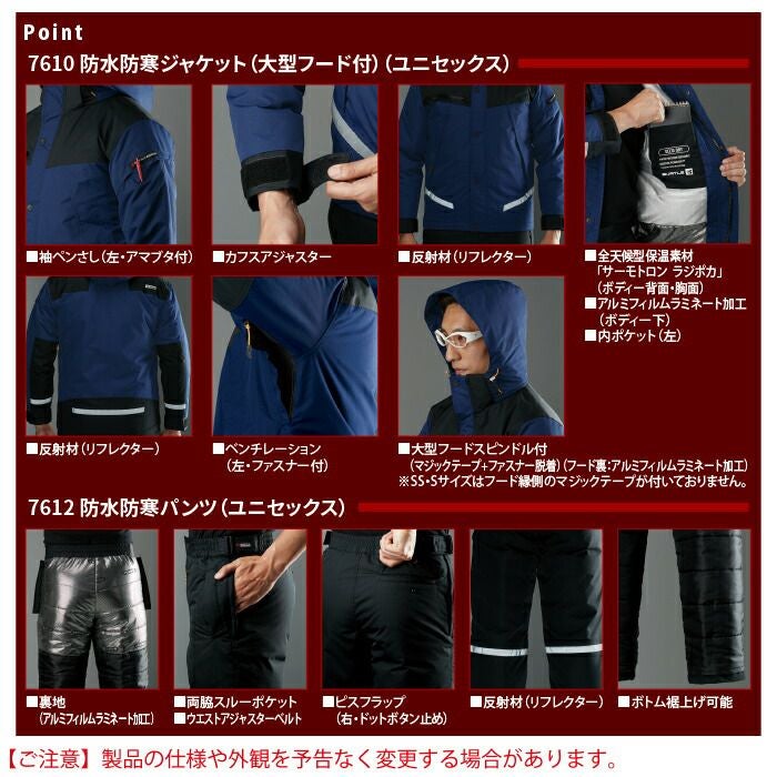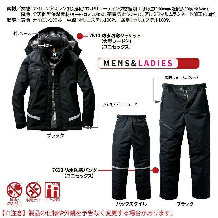 作業服 作業着 バートル 防寒着 秋冬用 バートル BURTLE 作業着 防寒着 上下セット 7610 防水防寒ジャケット(大型フード付)SS-3L と 7612 防水防寒パンツ SS-LL 秋冬用 作業服 おしゃれ