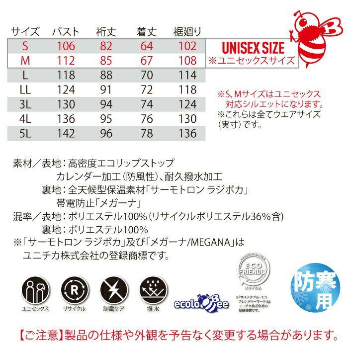 SDGs対応 エコロジカルな軽量防寒ウェア バートル BURTLE 作業着 防寒着 7420 軽防寒ジャケット 5L 秋冬用 撥水 防風 保温 ユニセックス エコ 帯電防止 作業服