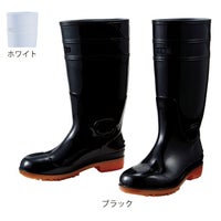 ●オールシーズン用●耐滑仕様、抗菌機能、衝撃吸収、使用素材 [アッパー]PVC(耐油) [ミッドソール]PVC(耐油) [アウトソール]PVC(耐油) [先芯]スチール芯、重量約925g標準/26.0cm(片足)、ウィズ4E、長さ調節可能なカットライン入り、脱ぎ履きしやすいフィン付き、水や油に強い耐滑ソール、フロントマーク、サイドマーク●カラー:ホワイト、ブラック