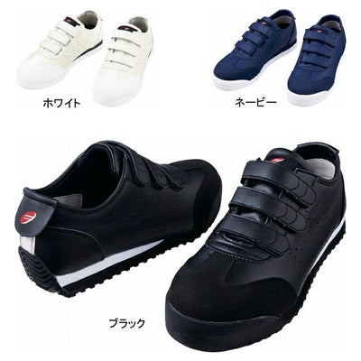 ●オールシーズン●素材:アッパー:合成皮革、ミッドソール:EVA、アウトソール:合成ゴム(耐油ラバー)、先芯:スチール芯●機能:JSAA A種認定品、耐滑仕様、抗菌防臭機能、衝撃吸収、プロテクティブスニーカ規格型式合格品、認定番号:1508●重量:約400g標準/26cm(片足)●ウィズ:3E●カラー:ネービー、ホワイト、ブラック