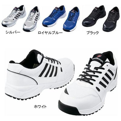 ●オールシーズン用●アッパー/合成皮革 ポリエステル、ミッドソール/EVA、アウトソール/合成ゴム(耐油ラバー)、先芯/スチール芯●耐滑仕様、衝撃吸収、重量約355g標準/26.0cm(片足)、ウィズ3E、ベロ部分ブランドネーム、つま先部分反射材使用、サイド部分反射材使用、クッション性の高いEVAミッドソール、水や油に強い耐滑ソール、踵部分反射パイピング●カラー:シルバー、ホワイト、ブラック、ロイヤルブルー