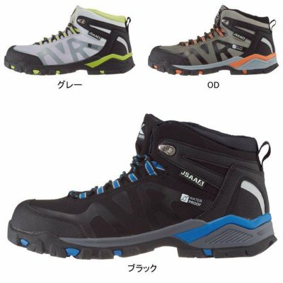 防水機能を搭載したセフティシューズ。5cm/5時間の防水機能を搭載。水を扱う現場や雨の日の野外作業に最適なモデル。アッパーの裏材に防水フィルムを貼り合わせることで、水の浸入を防ぎます。縫製部分には防水シームテープを貼り合わせ水の浸入を防ぎます。靴ベロは水やホコリの侵入を防止する水掻き付き。トレッキングシューズを参考にした靴底意匠を採用。悪路やハードな現場でも滑りにくい意匠です。