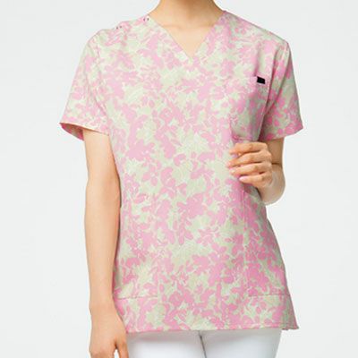●左腕にピンクリボンマークの刺繍がつきます。従来のスクラブより女性らしいシルエットに整えました。左胸ポケット 両腰ポケット 左袖ピンクリボン刺繍入り