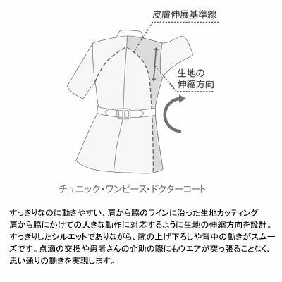 ●制電性・防縮・防汚・吸汗・透け防止・抗菌・防臭加工。デコルテラインに沿ったパイピング仕様。ウエストサイズ調整はアジャスターベルト式。ボタンがアクセントのフラップポケット。左袖にブランドロゴがつきます。右腰ポケット内側ペン挿し布付/袖下ゴム入り。左胸ポケット/両脇ポケット。ブランドロゴ入り。