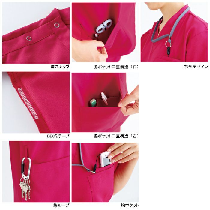 ●関連商品※WH11485A男女兼用スクラブ※WH11485B男女兼用スクラブ※WH11485C男女兼用スクラブ※WH11486A男女兼用パンツ※WH11486B男女兼用パンツ●素材:ツイル●混率:ポリエステル100%●抗菌、帯電防止素材、消臭、吸汗、速乾、小物用二重ポケット、工業洗濯対応商品●サイズ:SS、S、M、L、LL、EL、4L●カラー:ダークグレー、ブラック、アクア、チェリーピンク、ライトパープル、バーガンディ、