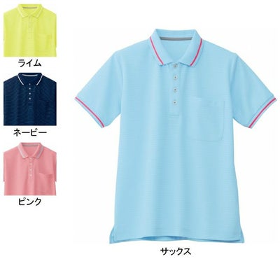 ●オールシーズン用●素材/鹿の子ボーダー ポリエステル95% 綿5%●吸汗・速乾、抗菌、消臭、衿・袖口フライスライン入り、DEOテープ、三層釦●サイズ:SS、S、M、L、LL、3L、4L、5L●カラー:サックス、ネービー、ライム、ピンク
