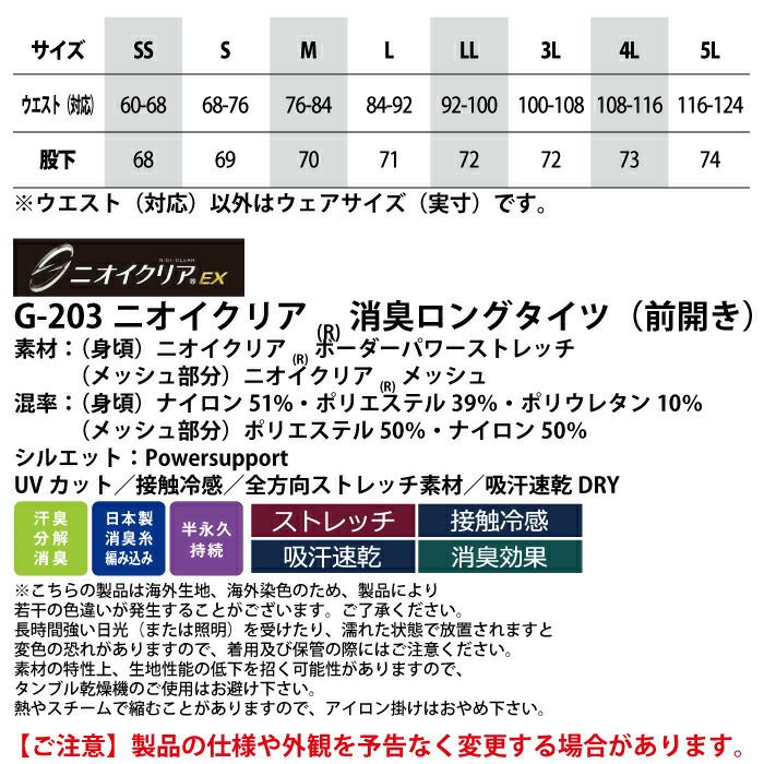 コーコス 作業服 作業着 作業ズボン インナー 春夏用 コーコス G-203 ニオイクリア消臭冷感ロングタイツ(前開き) 4L-5L