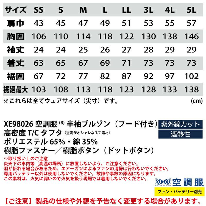 空調服 ジーベック XEBEC 作業服 作業着 空調服 ジーベック XEBEC 作業服 XE98026 空調服半袖ブルゾン(フード付き) 4L-5L 作業着 春夏用 熱中症 レジャー アウトドア スポーツ