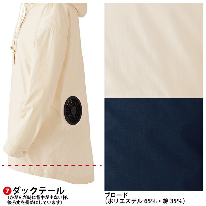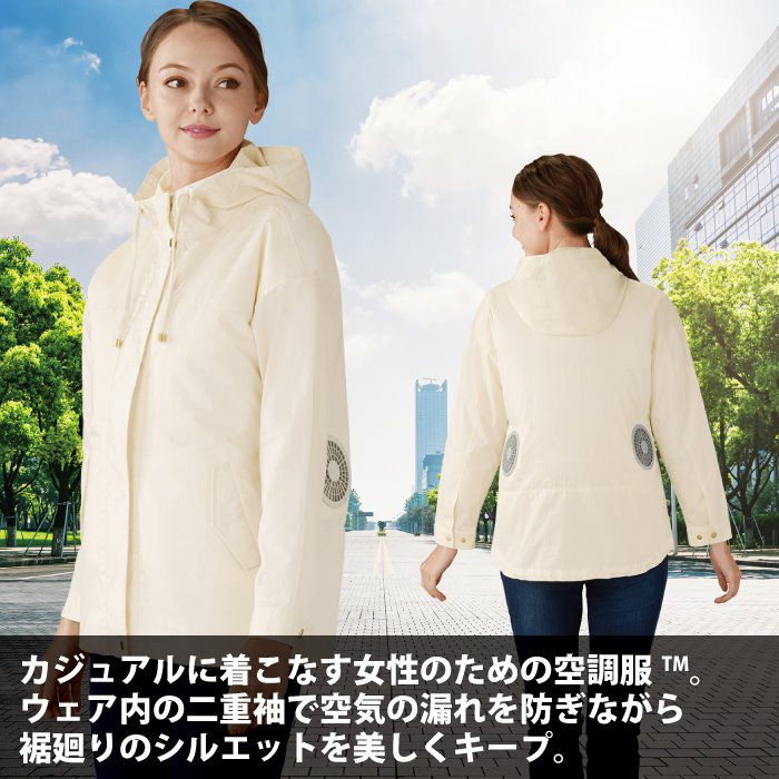 カジュアルに着こなす女性のための空調服。ウエア内の二重裾で空気の漏れを防ぎながら裾廻りのシルエットを美しくキープ。【お取扱い上のご注意】・専用のバッテリー以外は使用しないでください。故障や事故の原因になります。・炎天下の車内等(高温の場所)に放置しないでください。・ファンの羽が折れる可能性がある為、エアーガンによるファンの清掃は行わないでください。・この商品は火気を扱う現場では着用しないでください。