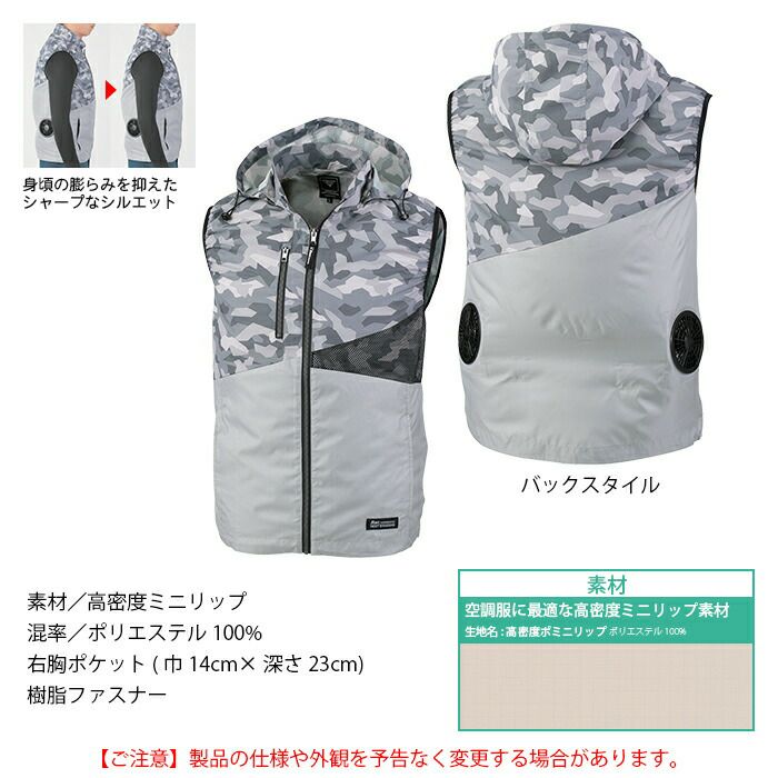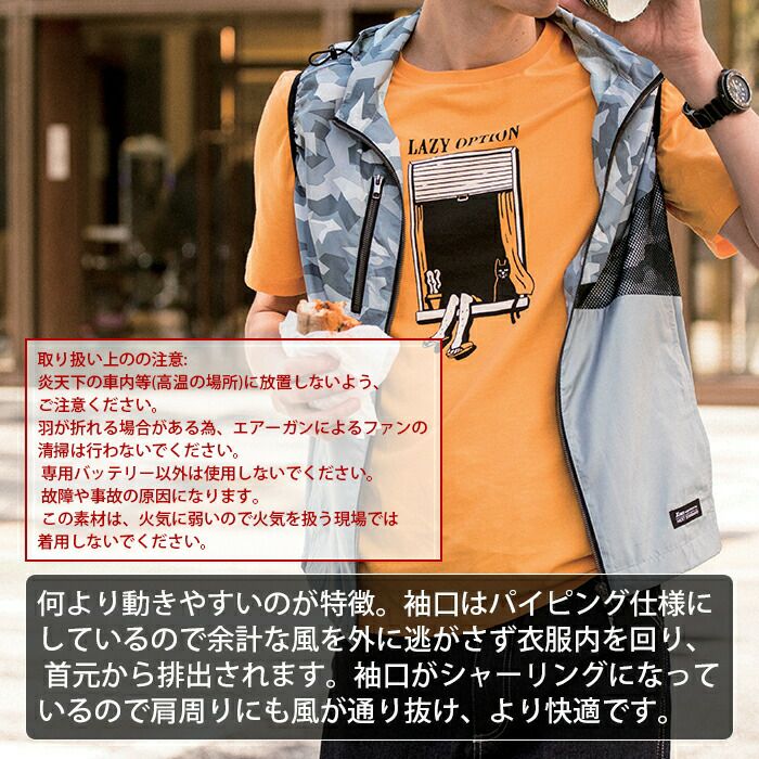 迷彩プリントとのツートーンがオシャレなカジュアルタイプベスト。何より動きやすいのが特徴。袖口はパイピング仕様にしているので余計な風を外に逃がさず衣服内を回り、首元から排出されます。袖口がシャーリングになっているので肩周りにも風が通り抜け、より快適です。身頃の膨らみを抑えたシャープなシルエット。【取り扱い上のご注意】炎天下の車内等(高温の場所)に放置しないよう、ご注意ください。羽が折れる場合があるため、エアーガンによるファンの清掃は行わないでください。専用バッテリー以外は使用しないでください。故障や事故の原因になります。この素材は、火気に弱いので火気を扱う現場では着用しないでください。