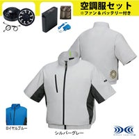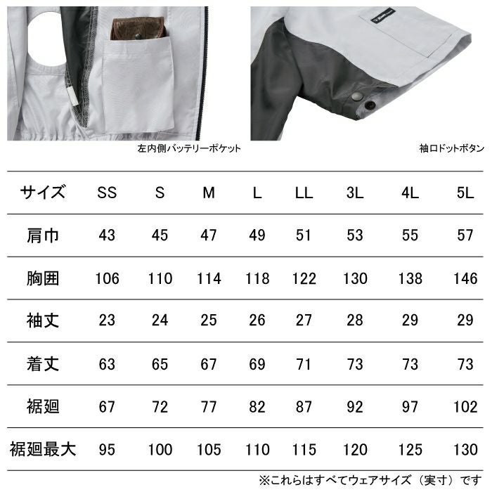 ●春夏用●素材:エアコンテックTM●混率:ポリエステル 100%●特徴:右胸ポケット(巾14cmx深さ24cm)、樹脂ファスナー、左袖ペン差し、右胸ファスナー付きポケット、両脇ポケット、衿裏配色テープ、袖底 脇に配色使用、首元調整紐で空気の抜けを調節、左内側バッテリーポケット、袖口ドットボタンで空気の抜けを調整●機能:透湿性、撥水加工、紫外線カット●取り扱い上のご注意:炎天下の車内等(高温の場所)に放置しないよう、ご注意ください。羽が折れる場合がある為、エアーガンによるファンの清掃は行わないでください。専用バッテリー以外は使用しないでください。故障や事故の原因になります。この素材は、火気に弱いので扱う現場では着用しないでください。 ●サイズ:SS(肩巾/43、胸囲/106、袖丈/23、着丈/63、裾廻/67、裾廻最大/95)、S(肩巾/45、胸囲/110、袖丈/24、着丈/65、裾廻/72、裾廻最大/100)、M(肩巾/47、胸囲/114、袖丈/25、着丈/67、裾廻/77、裾廻最大/105)、L(肩巾/49、胸囲/118、袖丈/26、着丈/69、裾廻/82、裾廻最大/110)、LL(肩巾/51、胸囲/122、袖丈/27、着丈/71、裾廻/87、裾廻最大/115)、3L(肩巾/53、胸囲/130、袖丈/28、着丈/73、裾廻/92、裾廻最大/120)、4L(肩巾/55、胸囲/138、袖丈/29、着丈/73、裾廻/97、裾廻最大/125)、5L(肩巾/57、胸囲/146、袖丈/29、着丈/73、裾廻/102、裾廻最大/130)●カラー:シルバーグレー、ロイヤルブルー