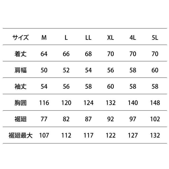 ●サイズ:M(着丈/64、肩巾/50、袖丈/54、胸囲/116、裾廻り/77、裾廻り最大/107)、L(着丈/66、肩巾/52、袖丈/56、胸囲/120、裾廻り/82、裾廻り最大/112)、LL(着丈/68、肩巾/54、袖丈/58、胸囲/124、裾廻り/87、裾廻り最大/117)、XL(着丈/70、肩巾/56、袖丈/60、胸囲/132、裾廻り/92、裾廻り最大/122)、4L(着丈/70、肩巾/58、袖丈/58、胸囲/140、裾廻り/97、裾廻り最大/127)、5L(着丈/70、肩巾/60、袖丈/58、胸囲/148、裾廻り/102、裾廻り最大/132)