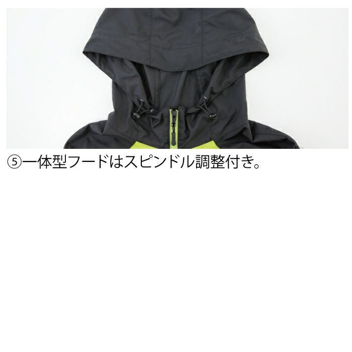 ●春夏用●素材:高密度ポリエステルタフタ●混率:ポリエステル100%、樹脂ファスナー●男女兼用、[フード]一体型フードはスピンドル調整付き、[両脇]モノが落ちにくいファスナー付きポケット、[袖口]ニットバインダー仕様で空気が逃げにくい、[首元]調整ヒモで空気の抜けを調節、[左内側]バッテリーポケット●サイズ:SS、S、M、L、LL、3L、4L、5L●カラー:ディープネイビー、シルバーグレー、イエローグリーン、迷彩ブルー、迷彩ブラック