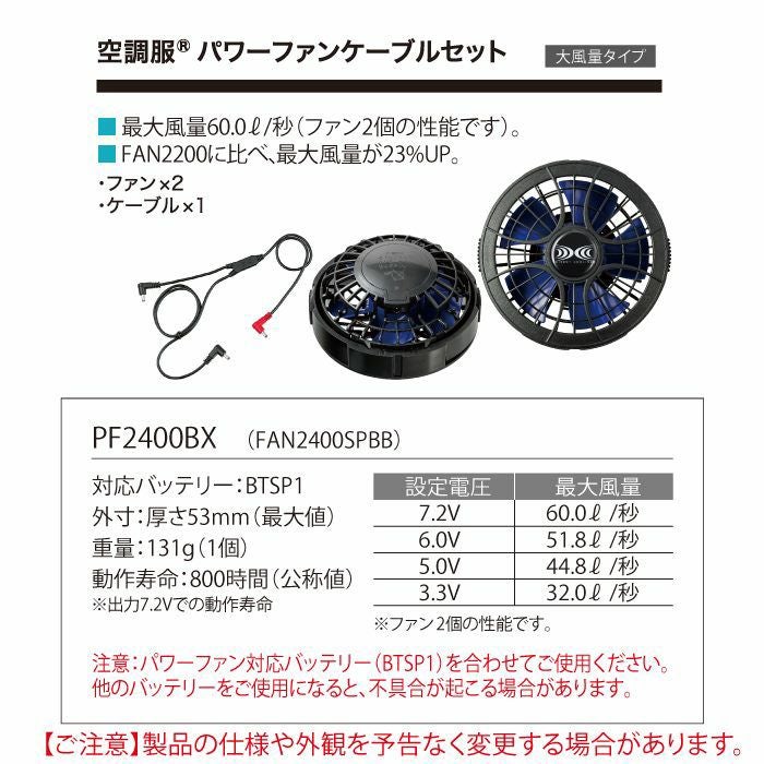 ●オールシーズン用●[対応バッテリー]BTSP1、[外寸]厚さ53mm(最大部)、[重量]131g(1個)、[動作寿命]800時間(公称値)※出力7.2Vでの動作寿命、[設定電圧/最大風量]7.2V:60.0リットル/秒、6.0V:51.8リットル/秒、5.0V:44.8リットル/秒、3.3V:32.0リットル/秒※ファン2個の性能です、【注意】パワーファン対応バッテリー(BTSP1)を合わせてご使用ください。他のバッテリーをご使用になると、不具合が起こる場合があります。【付属品】ファン×2、ケーブル×1