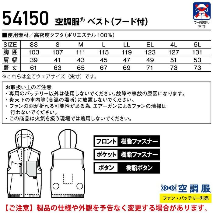 空調服 自重堂 作業服 作業着 空調服 自重堂 作業服 54150 空調服ベスト(フード付) EL 作業着 春夏用 熱中症 レジャー アウトドア スポーツ