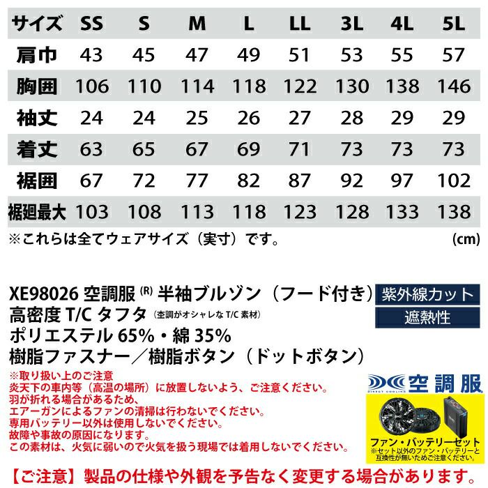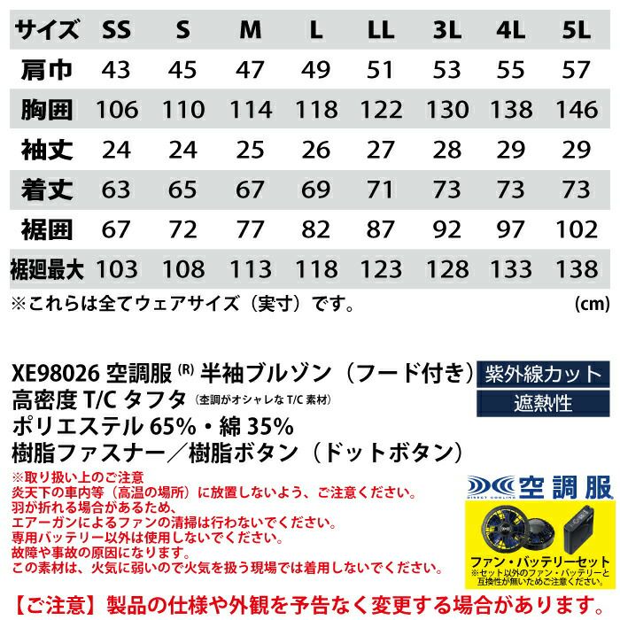 空調服 電動ファン 作業服 XEBEC 空調服 電動 ファン対応 春夏用 ジーベック 作業服 作業着 XE98026setR4(SK0012) 空調服半袖ブルゾン(フード付き) バッテリとファンのセット SS-LL