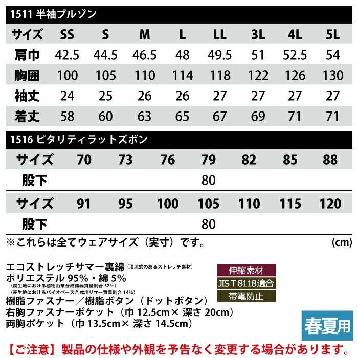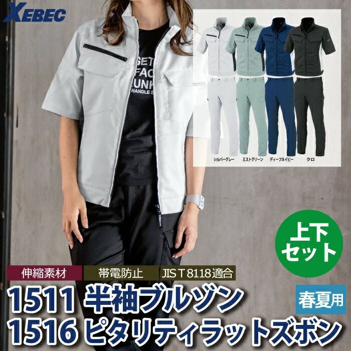ジーベック XEBEC 作業服 作業着 作業ズボン ジーベック XEBEC 作業服 上下セット 1511 半袖ブルゾンS-3L と 1516 ピタリティラットズボン 70-100 カーゴパンツ 春夏用 作業着