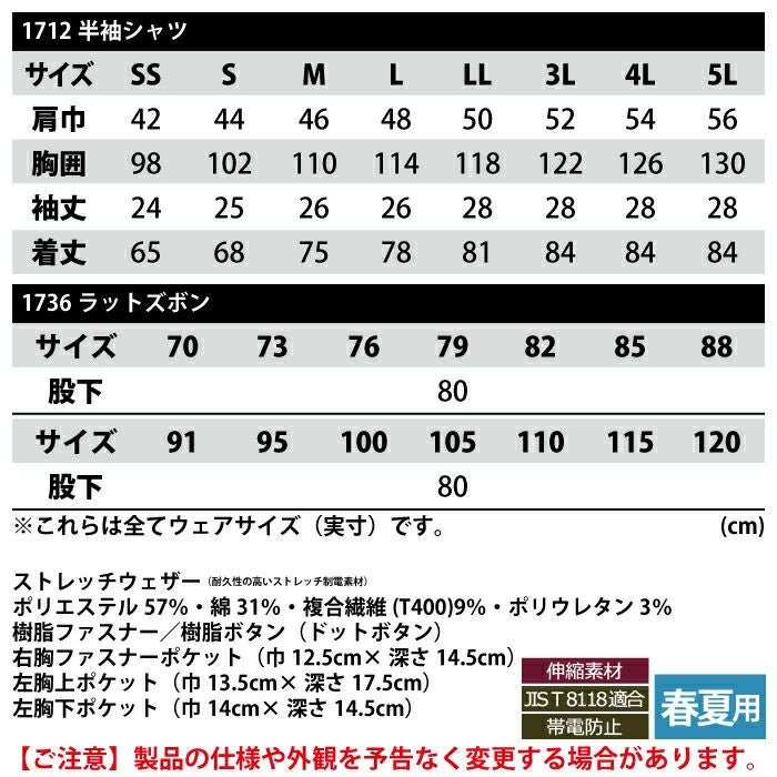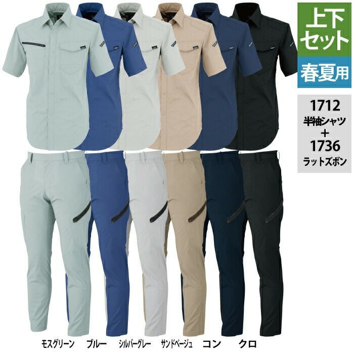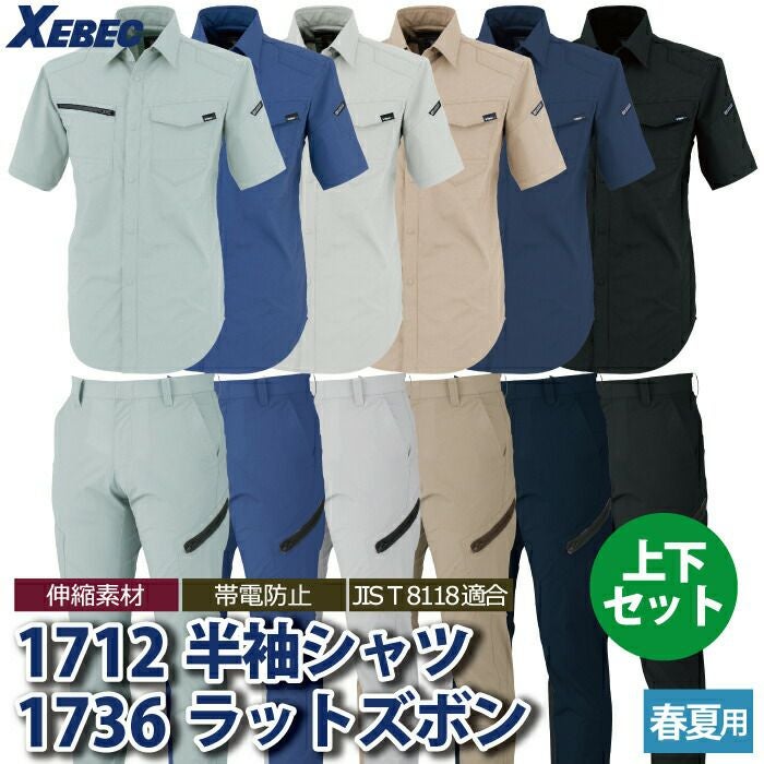 ジーベック XEBEC 作業服 作業着 作業ズボン ジーベック XEBEC 作業服 上下セット 1712 半袖シャツM-3L と 1736 ノータックラットズボン 70-100 カーゴパンツ オールシーズン 作業着