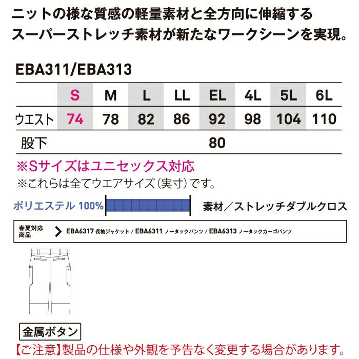 作業服 作業着 ビッグボーン bigborn 作業服 作業ズボン EBA313 ノータックカーゴパンツ S-LL オールシーズン 作業着