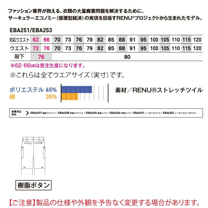作業服 作業着 ビッグボーン bigborn 作業服 作業ズボン EBA253 ノータックカーゴパンツ 62-88 オールシーズン 作業着